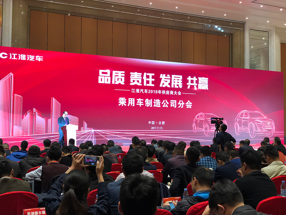 江淮汽车2017年供应商大会以“品质 责任 发展 共赢”为主题,会议期间,江汽集团控股公司董事长、总裁安进出席会议并作重要讲话,他希望各家供应商进一步通力合作,为江淮汽车的发展互助共赢,同时还举行了颁奖盛典。