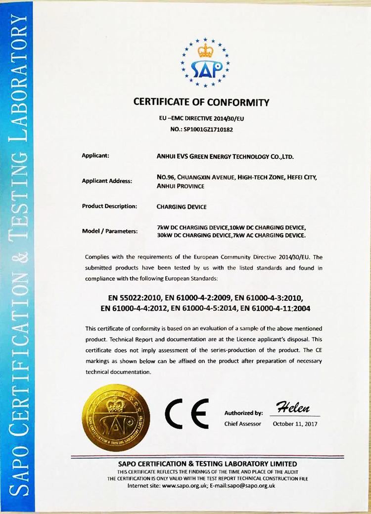 2017年12月5日,易威斯新能源喜报捷传——易威斯自主研发的7kW直流充电桩、10kW直流充电桩、30kW直流充电桩、7kW交流充电桩顺利通过严格检测,于业内率先取得了国际CE认证证书,获得了欧盟市场的通行证,为安徽充电桩走向国际市场打开了一个全新的局面。