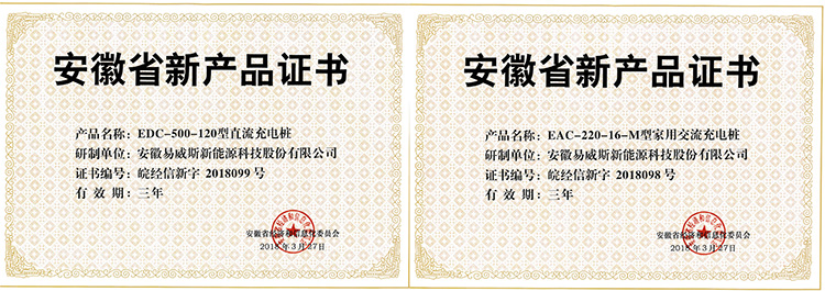 易威斯新能源多款充电桩产品荣获2018年第一批安徽省省级新产品称号。
