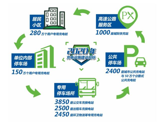《电动汽车充电基础设施发展指南(2015-2020年)》中确定 2020 年充电基础设施建设目标:居民小区280万个用户专用充电桩、高速公路服务区1000座城际快充站、单位内部停车场150万个用户专用充电桩、公共停车场2400座城市公共充电站与50万个分散式公共充电桩、专用停车场所3850座公交车充换电站,2500座出租车充换电站,2450座环卫物流等专用充电站。