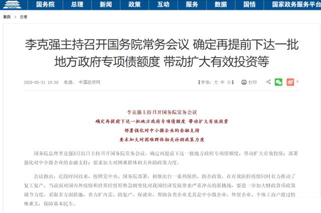 据央视新闻,国务院总理李克强3月31日主持召开国务院常务会议,确定再提前下达一批地方政府专项债额度,带动扩大有效投资;部署强化对中小微企业的金融支持;会议主要从财政政策、货币金融政策、困难群体保障、促进汽车消费四方面提出一系列支持政策,可谓力度之大。