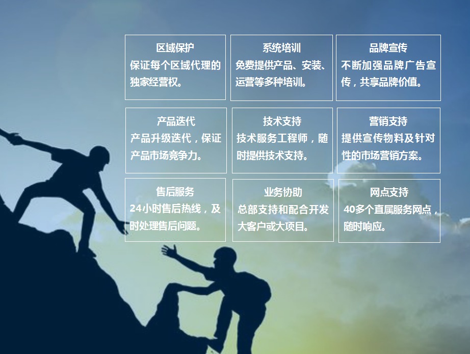 根据不同的代理模式,提供区域保护、系统培训、品牌宣传、产品迭代、技术支持、营销支持、售后服务、业务协助、网点支持等更多全方位贴心帮扶,让您运营无忧,省心省力,抓住新能源市场新的发展机遇!