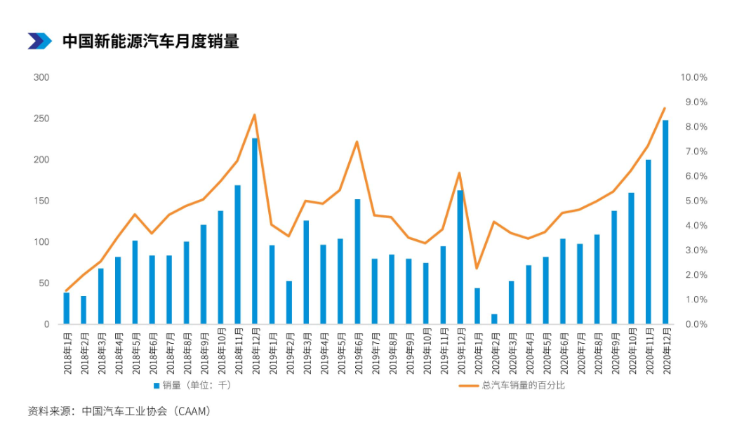 自 2015 年起,中国已经成为全球最大的新能源汽车销售市场,且预计未来几年仍将继续保持这一领先地位。尽管如此,中国的新能源汽车市场也经历了跌宕起伏。据中国汽车工业协会统计,2019 年,本地制造的新能源汽车(包括乘用车和商用车)批发销 量合计 121 万辆,同比减少 4.0%。其主要原因包括宏观经济增长的进一步放缓,以及新能源汽车补贴缩水。由于新冠疫情(COVID-19)的影响,2020 年上半年同比销量进一步下跌了 37.4%。然而,随着国内商业活动比全球其他大部分地区更早复苏,以及政府消费刺激政策的出台,月销售量短期出现了较为强劲的双位数或以上增长。也使 2020 年全年新能源汽车销售增长转正为 10.9%。