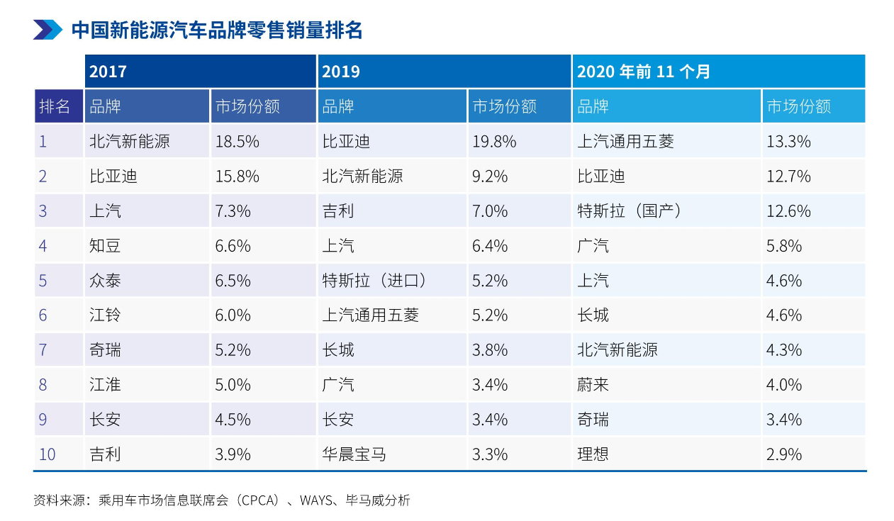 近几年,国内厂商整体占据了中国新能源汽车市场超过 80% 的市场份额,主要因为外国传统汽车厂商的新能源汽车车型乏善可陈,入门级乘用车领域尤为如此。尽管本土品牌占据了总体主导地位,却由于产品和消费者认可度变化而面临着受欢迎品牌不断更替的情况。具体而言,补贴后售价低于人民币 50,000 元的低端微型(A00 级)纯电动车在 2018 年以前广受欢迎,使主要关注此类产品的“知豆”“众泰”等规模较小的 OEM 厂商从中受益。然而,随着补贴的减少和获取补贴技术要求的日益提升,“广汽”“长 城”等具备更强研发能力的大型本土 OEM 厂商已将此类规模较小的 OEM 厂商挤出市场, 从而占据市场主导地位。此外,通过近期观察我们还发现本土 OEM 厂商的如下趋势:首先,微型纯电动车出现复苏迹象,其质量和配置均有所提升,较为成功的车型包括“上汽通用五菱”的宏光 MINIEV 和“长城”的欧拉 R1。此类汽车多作为日常低成本短途通勤之用,有别于传统 汽车消费理念。其次,部分初创品牌,包括“蔚来”“理想”“小鹏”等,已经通过价格相对更高的新能源车型建立了领先优势。这意味着新能源车型在各消费群体中的接受程度已经得到拓宽,也表示总体汽车市场出现了更为健康的发展。