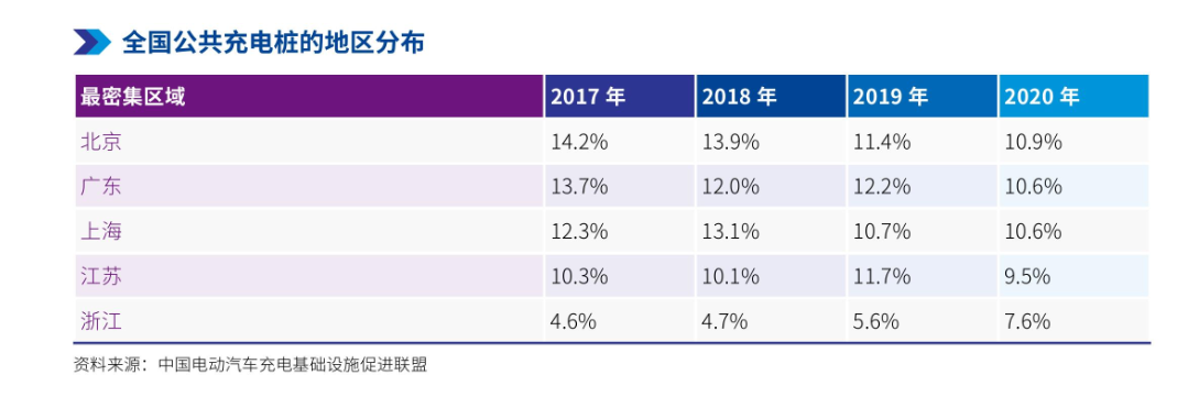 一直以来,新能源汽车充电设施不足是阻碍消费者转向新能源汽车的一个关键问题。据中国电动汽车充电基础设施促进联盟数据显示,截至 2020 年底,中国拥有 168 万个充电桩,远低于政府 2020 年原目标的 480 万个。这意味着平均每个充电桩需为三台新 能源汽车提供服务。此外,充电桩分布不均,人口较少的地区几乎无充电设施投资,市中心外围也只有少数公共充电桩。再者,燃油车占用充电车位,充电桩故障也频频出现。此类问题导致公共充电桩利用率低下,损害了充电网络运营商的利润,也影响了新能源车主对电动车设施有效性的信任。在中国人口稠密的大城市,安装私人充电桩也非易事。按照中国电动汽车充电基础设 施促进联盟的预计,截至 2020 年底,中国仅有 874,000 个私人充电桩,而政府原定的 2020 年目标为 430 万个。超过 30% 的新能源汽车车主无法安装自有充电桩,原因主要包括缺少固定车位和电力设施等。这导致车主们自行寻求方式各异的充电途径,此举可能存在安全隐患,也并非长久之计。